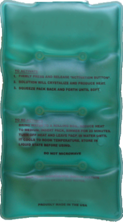 The heat pack is easily recharged by simmering them in hot water for a few minutes which also cleans and sterilizes them making them ready for the next time you may need them.